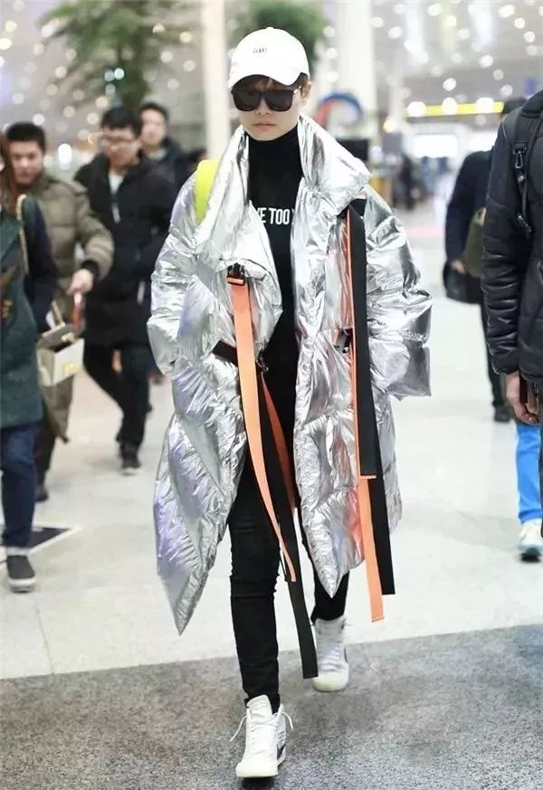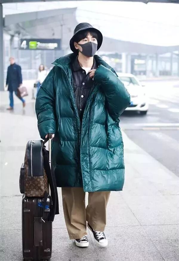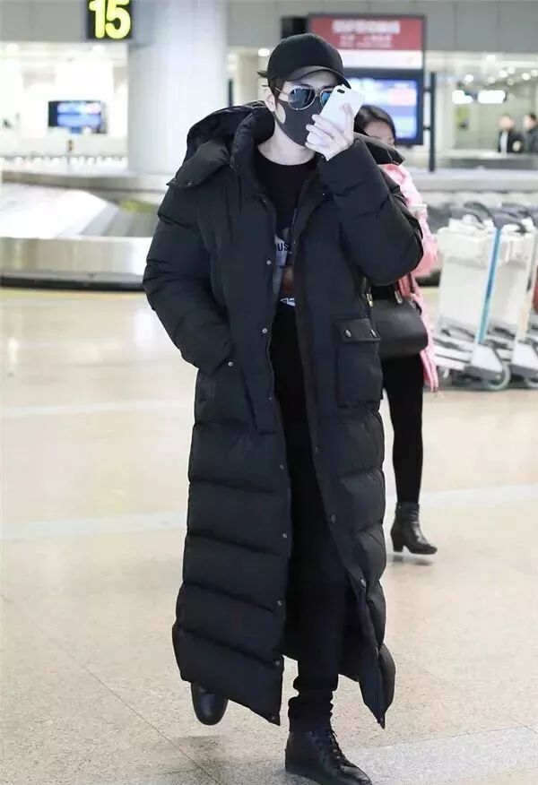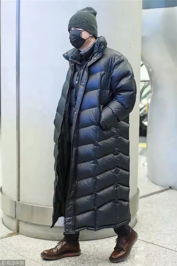 不仅是女明星哦,男明星也都开始用这种长及脚踝的羽绒服来保暖了,不过道理一样,越宽松越容易凹造型。陈学冬就这样用一身黑武装自己。