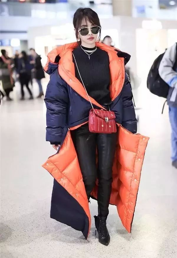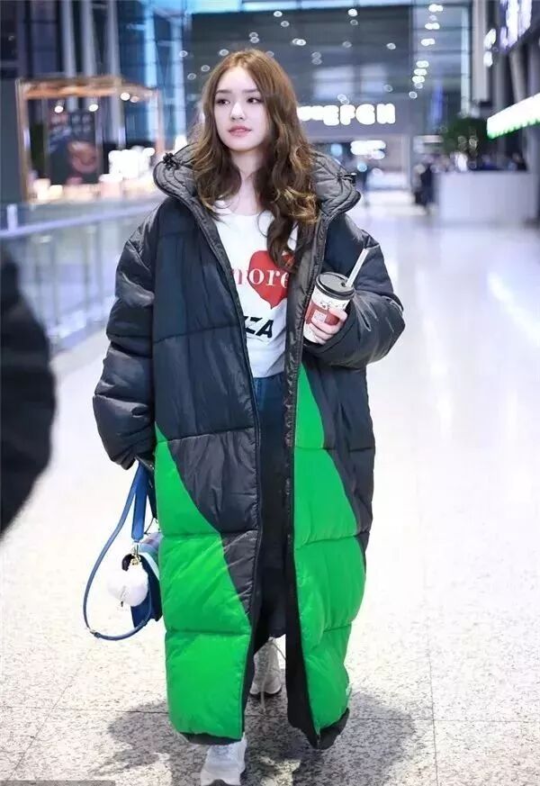林允全副武装,拼色及地羽绒服不给冷空气留一丝余地,小编表示也要来一款。