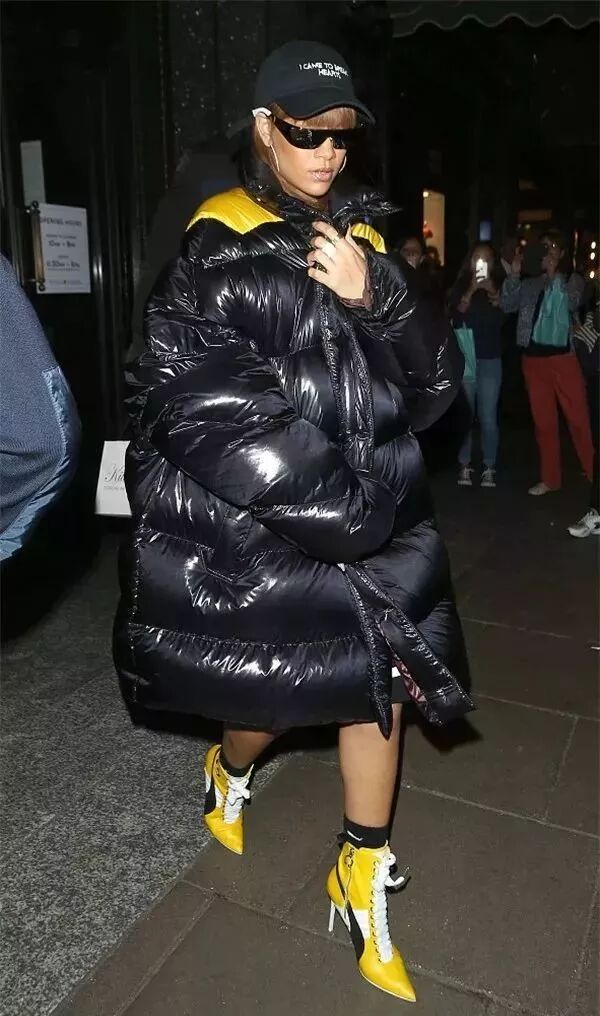 蕾哈娜这种上面阔摆羽绒服下面露腿的穿法既性感又不臃肿,不过却很冻人,没关系,下半身配一条紧身打底裤也能达到同样的效果。