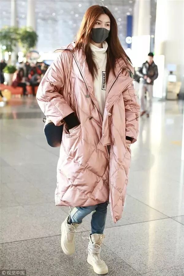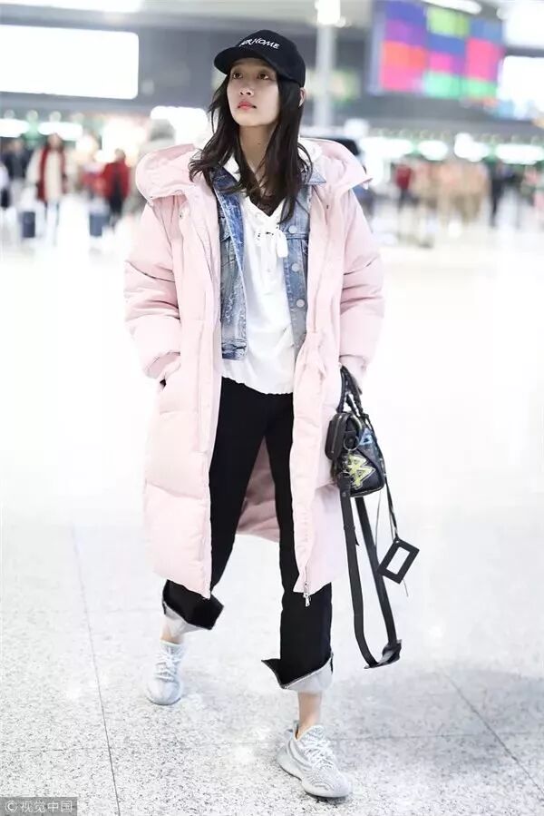 宽大的淡粉色羽绒服既能穿出少女感又不矫情。