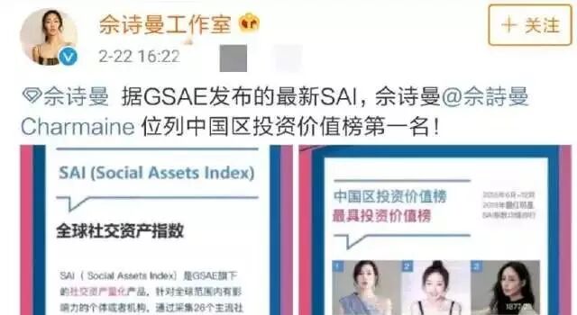 《延禧攻略》不仅让佘诗曼在内地变得炙手可热,还让她获得了一个“好消息”,2月22日,佘诗曼工作室在微博官宣“据GSAE发布的最新SAI,佘诗曼位列中国区投资价值榜第一名”。这个榜单指数是由26个主流社交媒体票选出来的,数据十分的公开透明,真实。