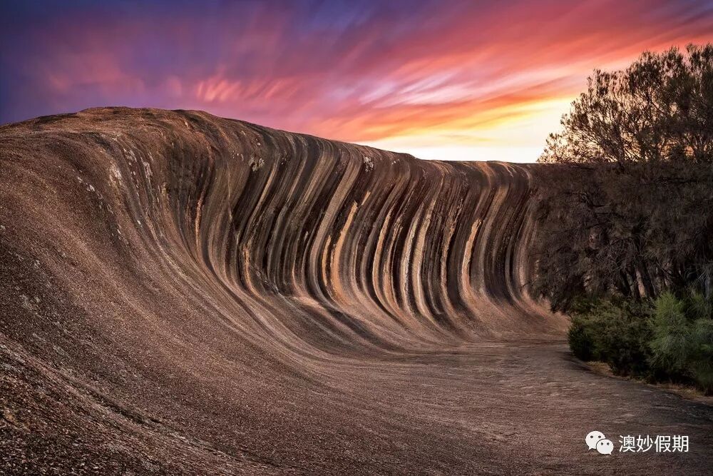 澳大利亚最长且距离海洋最远的波浪之一——波浪岩(Wave Rock)升腾于内陆平原之上 15 米高度。 经过大自然超过 27 亿年的雕琢,如今已成为广受欢迎的旅游景点。