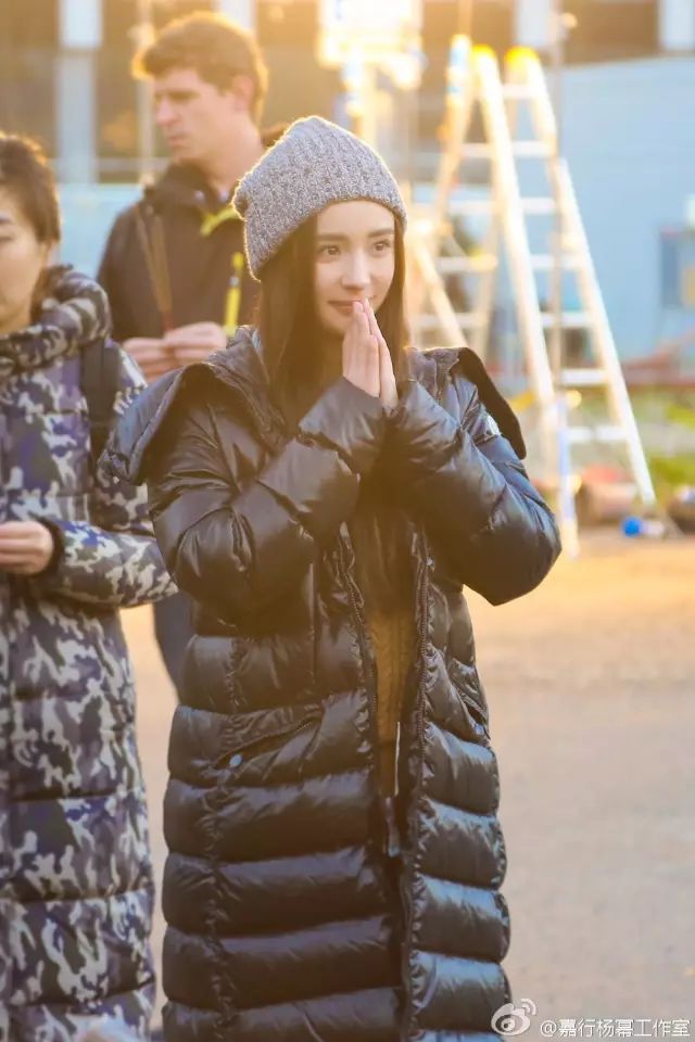杨幂这件亮黑色羽绒服大翻领是特色,是不是特别显脸小呢?搭配灰色毛线帽更随意好看。