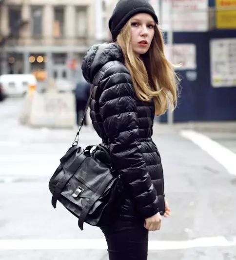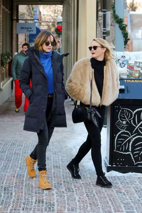 《五十度灰》的女主角Dakota Johnson的这件藏青色羽绒服样式比较普通,但是鞋子是亮点,马丁靴是搭配羽绒服的好帮手,鲜艳的颜色很出彩。