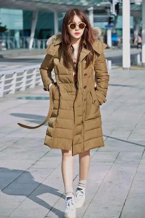 黑色看上去中性、保守,银白色则多了些帅气前卫的感觉,奚梦瑶这件宽松型的羽绒服搭配运动鞋帅气又时髦。