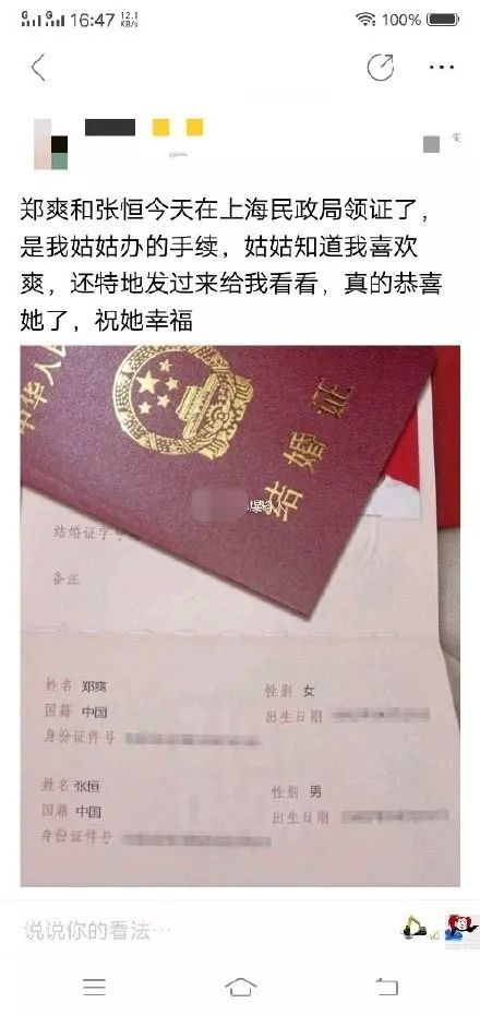 从爆料的截图上看,上面确实有郑爽和张恒的名字,但身份证号码和照片都被挡住了,爆料贴中这样写道:“郑爽和张恒今天在上海民政局领证了,是我姑姑办的手续,姑姑知道我喜欢爽,还特地发过来给我看看,真的恭喜她了,祝她幸福。”