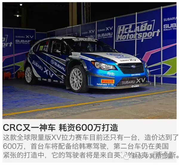 随着中汽联放开赛车的改装标准,从去年开始各大车队纷纷投入巨资,研发S6组CRC car,现如今的CRC car赛车拥有了堪比WRC赛车的综合实力,很多新赛车老外技师见了都会流口水。近日,又一款重金打造的S6组CRC car赛车来到了我们面前。5月6日,斯巴鲁汽车(中国)有限公司及斯巴鲁中国拉力车队在广东肇庆的广东国际赛车场举办了“V型呼啸-2016 SUBARU XV拉力赛车征战CRC”的启动仪式,全球首款SUBARU XV拉力赛车震撼亮相,韩寒也来到现场,测试他的这款新战车。据悉这台SUBARU XV拉力赛车造价达到了600万,实力非同凡响。