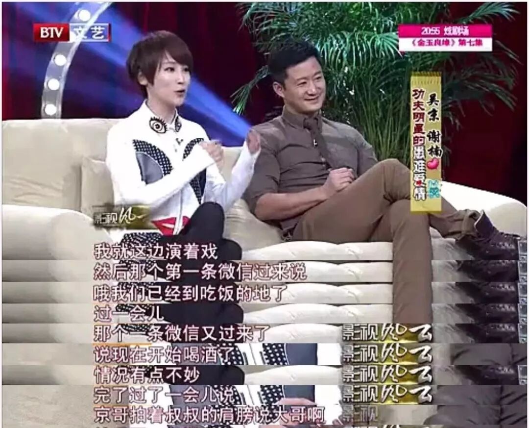 上完节目没多久后,两人就约出去吃了一顿饭。结果整顿饭下来的氛围都比较尴尬,谢楠想着人家是大明星,总不好一直“八卦”别人的事,就只能一直聊自己的工作,顺便想着“说不定能塑造个勤奋向上的好女孩形象”。而当时在香港漂泊过一段时间的吴京却一心想自己能早日有个归宿,“找个踏踏实实过日子的”。结果谢楠这样一聊,反倒让吴京误以为她是一个“事业心特强的女生”。