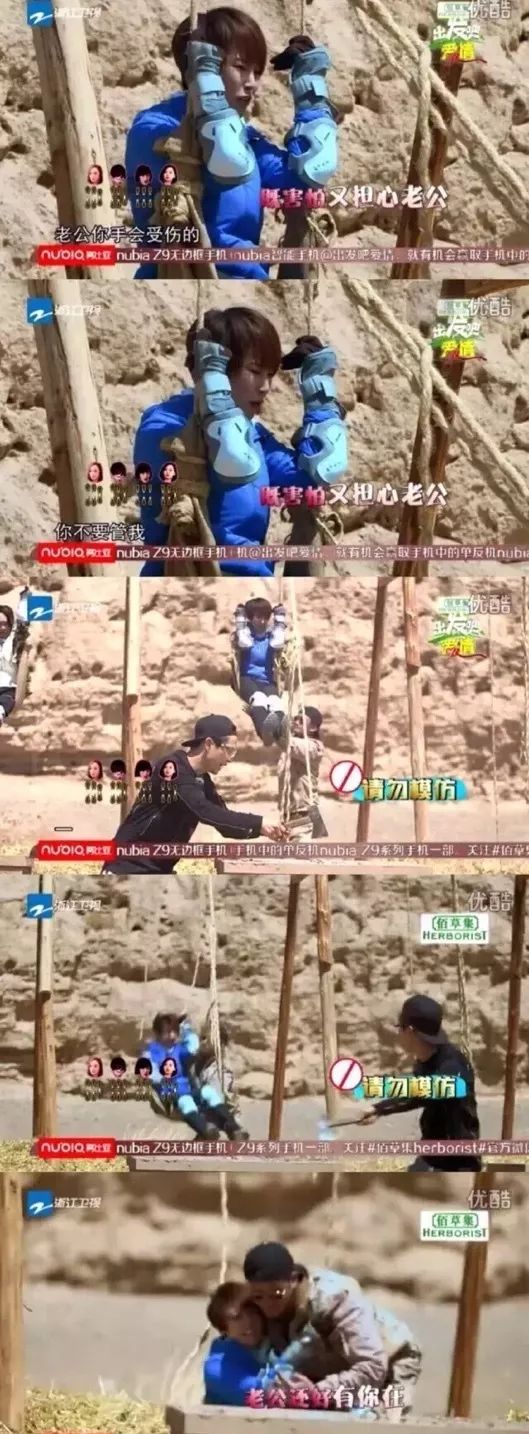玩游戏时谢楠要被割掉绳子,虽然明知道安全措施都做好了,但知道老婆心中不安后吴京二话不说上前接住老婆: