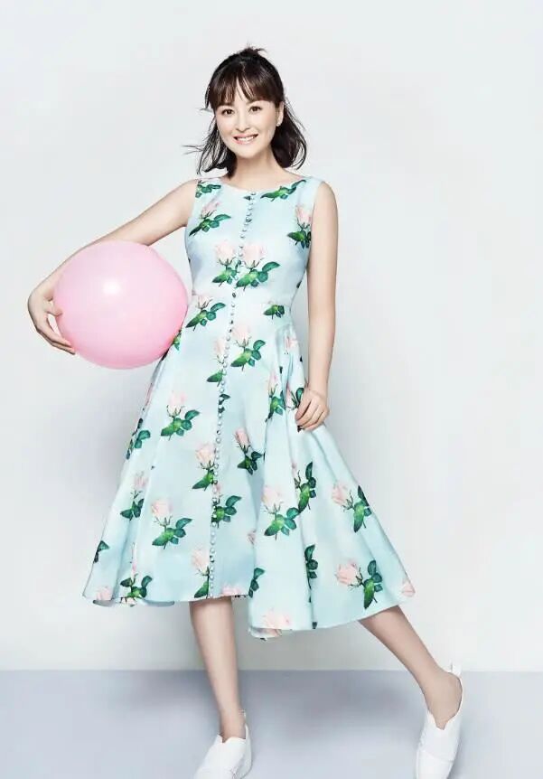 再看看戴娇倩其它搭配,相比上一件的时尚个性的连衣裙,这件简单清新的连衣裙更入我的眼,戴娇倩身穿碧绿的连衣裙,连衣裙的花朵图案看起来特别清新秀气,加上戴娇倩半扎的发饰,看起来清纯洋溢,妥妥的少女感。