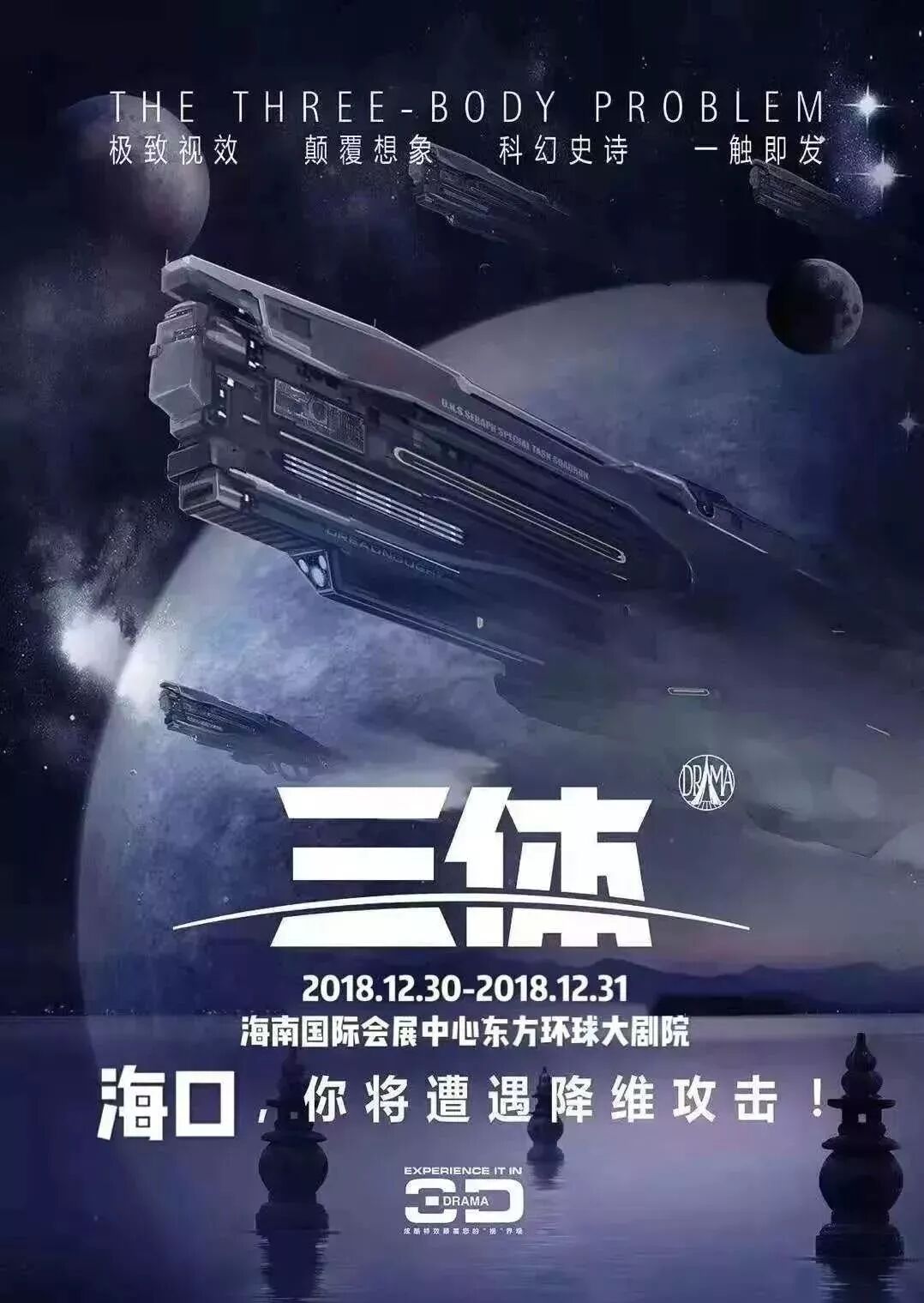 小说本身已达到难以企及的高度,而这一次,它打破了书本文字的局限性,耗资千万制作的《三体》舞台剧在刘慈欣的亲自坐镇监制下,搬上舞台,让三体世界率先在舞台上炸裂开来。 从北上广深到成都、重庆、武汉......《三体》舞台剧巡演所经过的地方,几乎场场爆满~ 而今天,风靡全国的3D硬核《三体》舞台剧,空降海口啦!