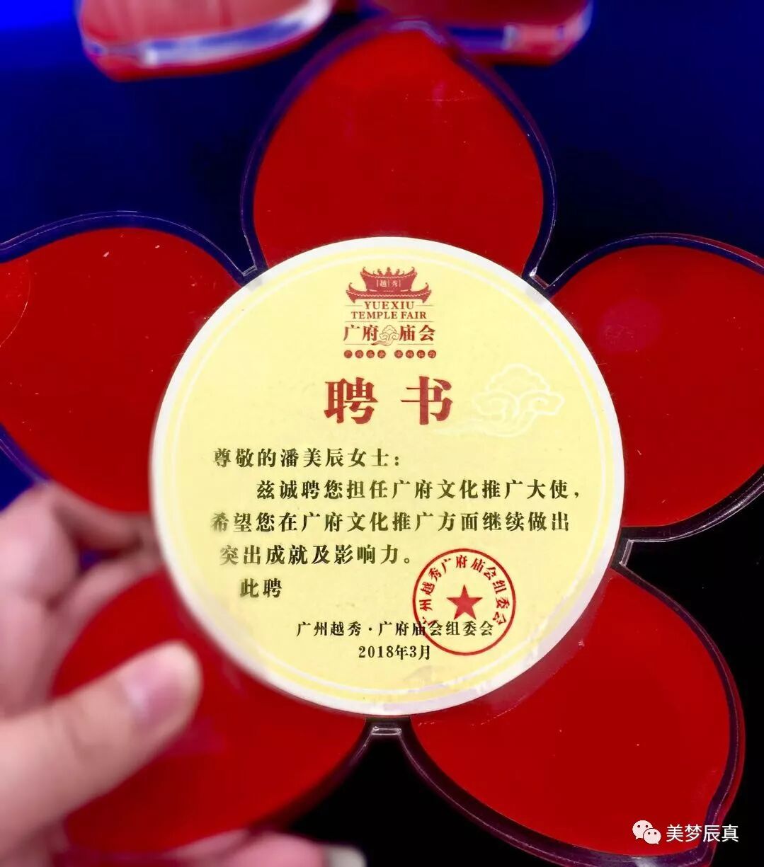 在十九大精神感召下,为了坚定广府文化自信,推动广府文化繁荣,更好地传承创新广府文化,本届大巡演以“广府梦•新传承”为主题,以“定点+巡游+巡演”的形式,融合各类精彩民俗节目,凝聚广府力量,求变求新,将传统与时尚、民族与世界相融合,为观众带来赏心悦目的视觉盛宴。期间,潘美辰参与方阵巡游,演唱金曲串烧,还荣获组委会颁发的“广府文化推广大使”称号。