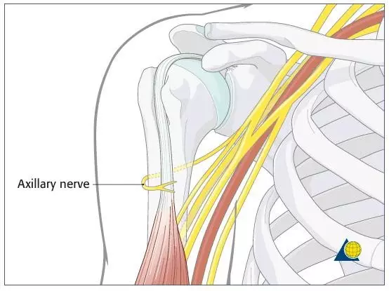 肱骨外科颈骨折,肩关节脱位或腋杖的压迫都可致腋神经损伤,损伤后主要表现为三角肌瘫痪,肩关节外展幅度变小或不能外展,三角肌区皮肤感觉障碍,倘三角肌萎缩,肩部失去圆隆外观,肩峰突出,形成“方肩”畸形。