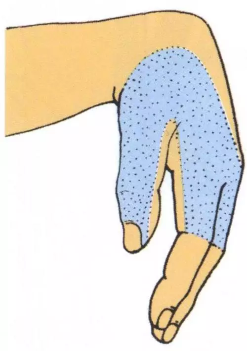 尺神经在前臂发出肌支支配尺侧腕屈肌和指深屈肌尺侧半;在手掌发出深支支配小鱼际肌、拇收肌、骨间肌及第3、4蚓状肌。尺神经的皮支在手掌分布于小鱼际、尺侧一个半指的皮肤;在手背分布于手背尺侧1/2、尺侧一个半指及无名指近节的桡侧半和中指近节尺侧半的皮肤。