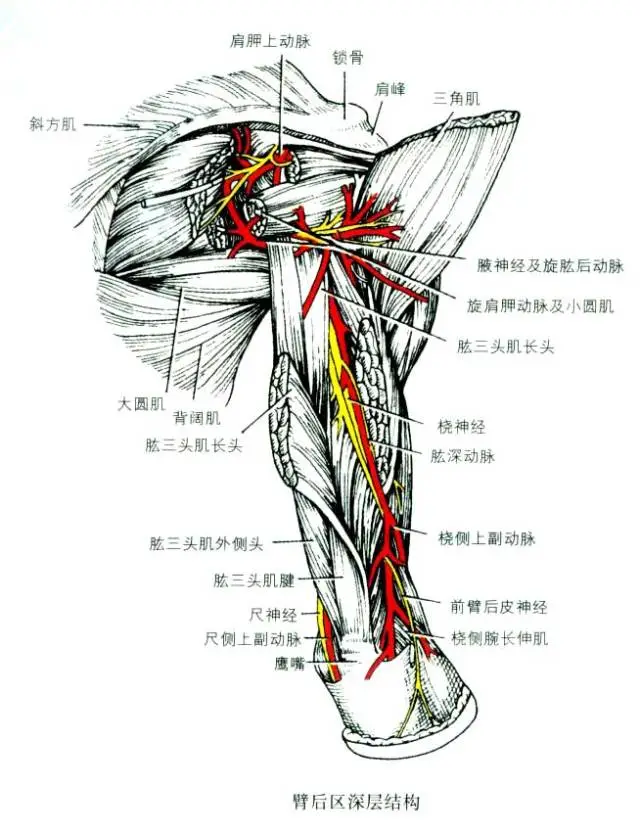 桡神经肌支支配肱三头肌、肱桡肌和所有前臂后群肌。皮支除上述外,还分布于臂和前臂后面的皮肤。