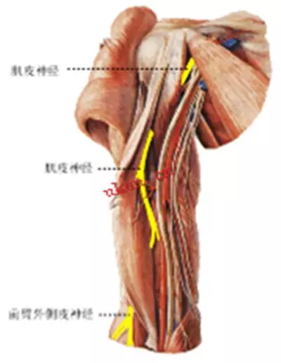 自外侧束发出向外下斜穿喙肱肌,经肱二头肌和肱肌之间下行,发出分支支配此三肌。终支在肘关节稍上方的外侧,穿深筋膜至皮下,改称前臂外侧皮神经,分布于前臂外侧皮肤。