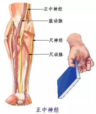 以两根分别起于内、外侧束,两根夹持腋动脉。向下成锐角汇合成正中神经,沿肱二头肌内侧缘伴肱动脉下行至肘窝,穿旋前圆肌于前臂指浅、深屈肌之间下行,经腕管至手掌。先发出正中神经反支进入鱼际,继而发出3条指掌侧总神经,再各分为2支掌侧固有神经至1~4指相对缘。