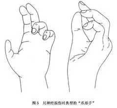 肱骨髁上骨折时易损伤尺神经。尺神经受损后主要表现为屈腕力弱,无名指和小指的远节不能屈;小鱼际肌萎缩变平坦,拇指不能内收;骨间肌萎缩,掌骨间出现深沟,各指不能相互靠拢;各掌指关节过身,第4、5指的指间关节弯曲,形成“爪形手”。手掌、手背内侧缘感觉丧失。