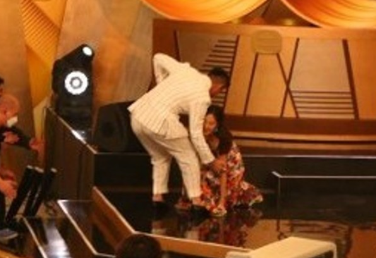 活动刚开始即出现惊险场面,以5吋高踭鞋衬吊带裙亮相的视后唐诗咏,上台时不慎连环仆,幸好有陈山聪的强劲臂弯救驾扶住她,英雄救美!