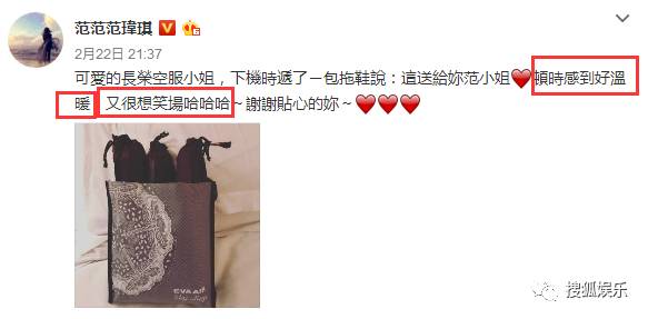 昨天,范玮琪在自己的微博表示,下飞机时收到了空姐的礼物——一包拖鞋,让她觉得好温暖,还想笑场。