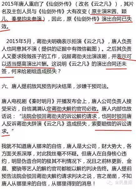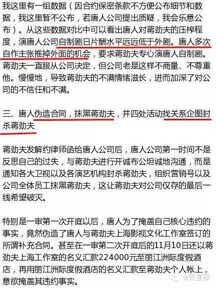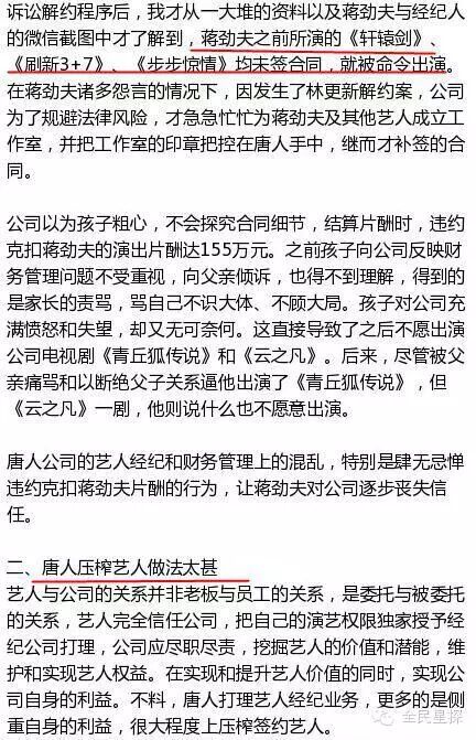 除了为蒋劲夫澄清,蒋爸在公开信里还痛斥唐人“六宗罪”:“1、拍摄《轩辕剑》《步步惊情》等剧时未签合同,补签合约后违约克扣蒋劲夫片酬155万;2、自作主张推掉外面的戏约,命令蒋劲夫只演自制剧;3、伪造合同;4、组织营销号和公司员工集体抹黑蒋劲夫、走关系企图封杀蒋劲夫;5、混淆视听,反诉蒋劲夫拒演;6、提前放风预告判决结果干预司法。”