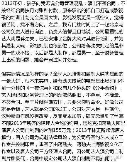 起因是1月29日蒋劲夫父亲发表了一封近五千字的公开信,他在信中从六方面痛斥唐人公司,声称唐人:“克扣蒋劲夫片酬,企图抹黑、封杀蒋劲夫。”
