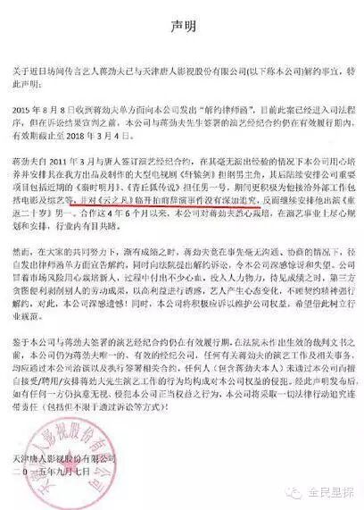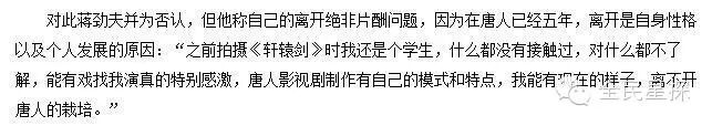 虽然蒋家父子不得不和唐人走到对簿公堂的一步,但一个月前,蒋劲夫受访时透露仍对唐人心存感激,“回忆是美好的,我有现在离不开唐人的栽培”,同时,他也强调,“离开绝不仅仅为了片酬”。