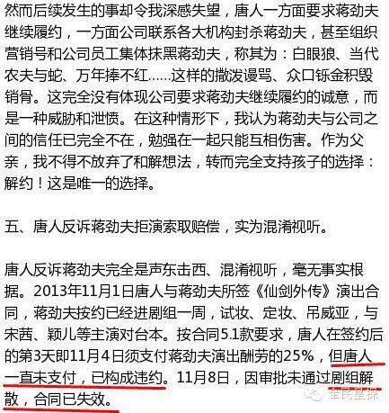 在蒋爸的公开信里,他首次为蒋劲夫澄清了唐人一直“单方面辞演”的指控。蒋爸称:“《云之凡》(原名《仙剑外传》)剧组解散过,重启时原主演都没参演,所以蒋签的《仙剑外传》合同已失效。唐人想让蒋劲夫演《云之凡》时还提出加片酬,说明《云之凡》合同根本没签。”