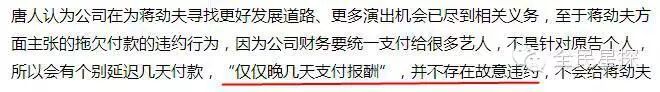 唐人对蒋劲夫的诉讼理由则称,“不是故意违约,只是晚几天支付”,并且仍声称蒋劲夫“单方面辞演已签约的合作”。