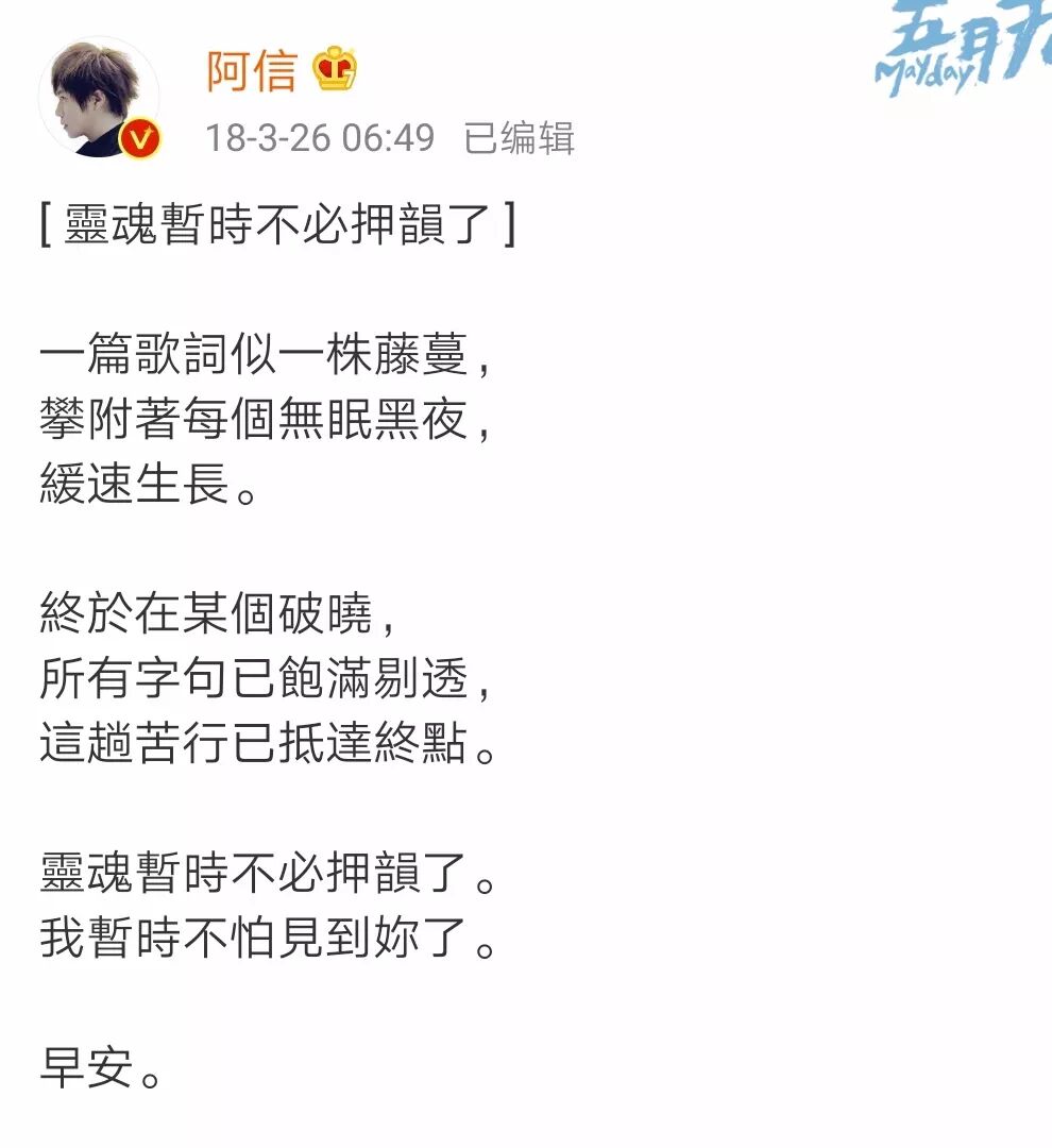 后来,阿信就发了一条《灵魂暂时不必押韵了》的短文。