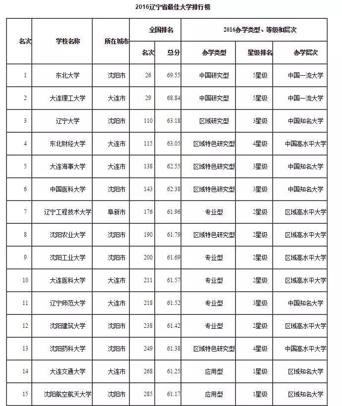 3.2016辽宁省最佳大学排行榜,东北大学蝉联榜首,全国排名第26。大连理工大学居第2,辽宁大学列第3;东北财经大学居第4,大连海事大学列第5;中国医科大学、辽宁工程技术大学、沈阳农业大学、沈阳工业大学、大连医科大学分列6到10位。