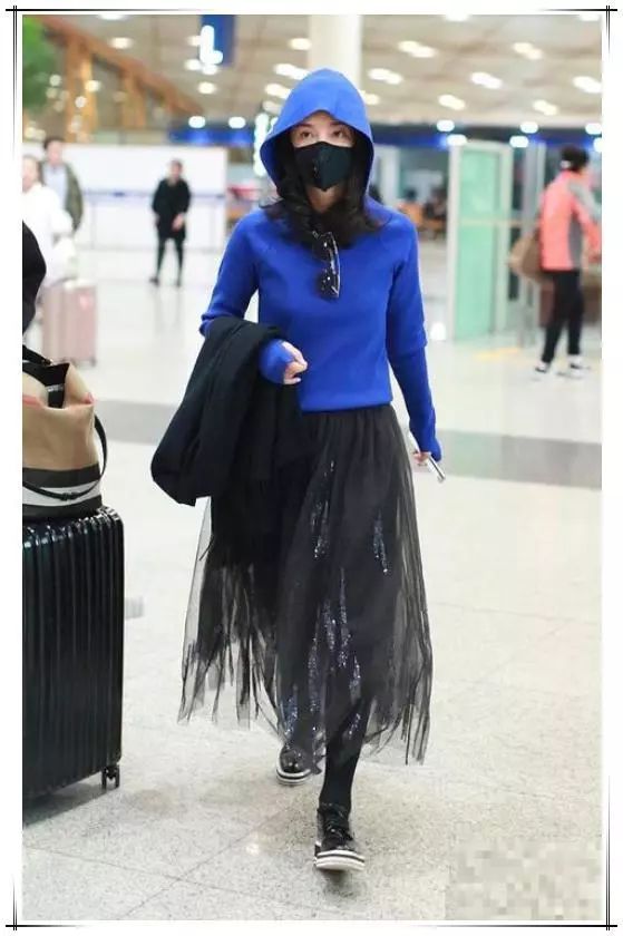 李冰冰现身机场,她穿了一件宝蓝色的卫衣,搭配黑色纱裙,看起来时尚感爆棚。头上戴着卫衣帽子,还戴了一副黑色的口罩,只顾着赶路,看起来非常的低调。