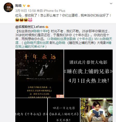 陈晓一直是爱护的,曾经因为女粉丝在剧组差点被骗顶住可预见的舆论压力也要站出来为粉丝发声,平常也是会经常跟粉丝在微博上互动,粉丝为陈晓制作的《十年永远》mv就是最好的见证。