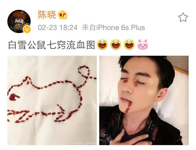 见过主演这么黑自己演的剧么,还有,“白雪公鼠”?!陈晓真是萌萌哒~另外,晓哥,耳朵忘流血了,没到七孔。