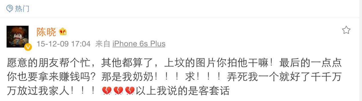 孝顺的陈晓对家人呵护备至,去年他和陈妍希回安徽老家被拍到看望逝去奶奶的的照片,某些媒体还用不恰当标题进行报道,惹怒了一向最看重家人的陈晓,即使是知道可能会对形象造成影响,陈晓还是忍不住在微博上对不良媒体表示了抗议。