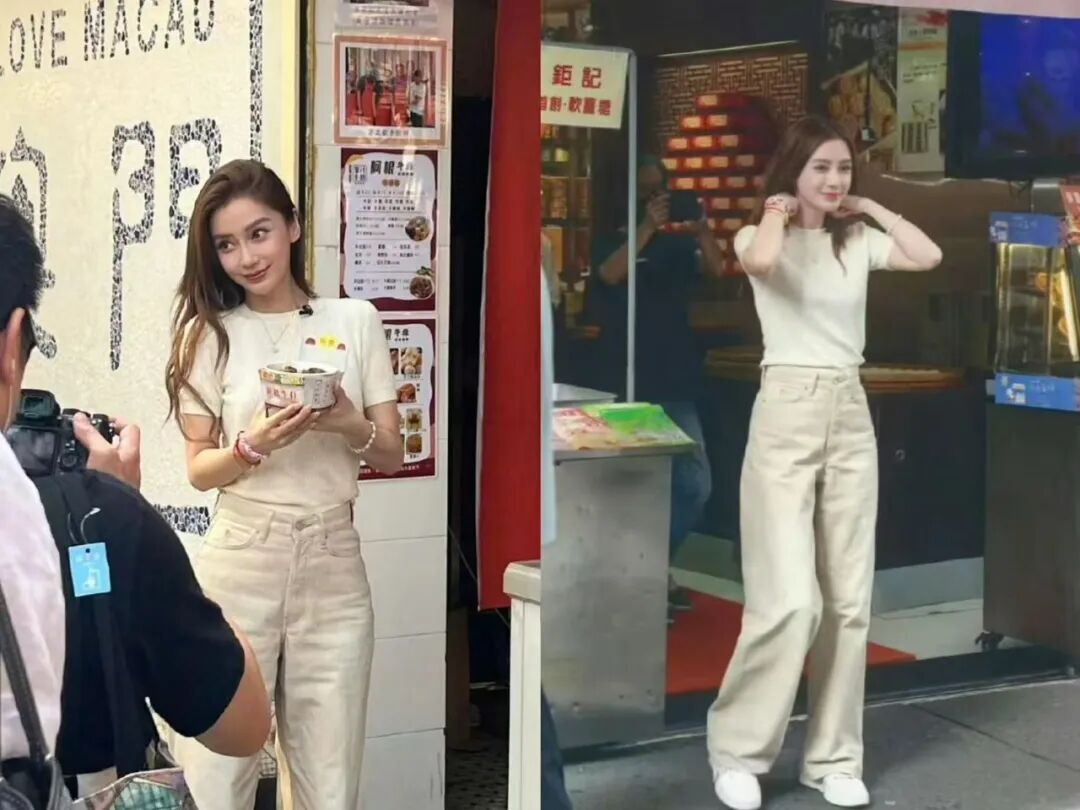 6月2日还被网友偶遇在吃澳门本地特色小吃“阿根牛杂”。在福隆新街及周边取景,身穿Loro Piana白色针织上衣、Acne Studios牛仔裤,搭配Harry Winston和Cartier首饰。