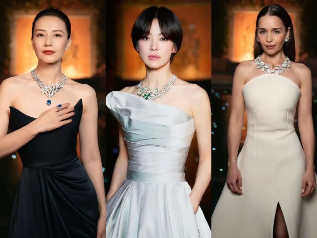 宋慧乔的白裙十分典雅大方,与高圆圆、Emilia Clarke 并肩而立,三位女神在Chaumet“绿野芳踪”高珠发布会的绿意萦绕间,诠释着自然万物的诗意礼赞。
