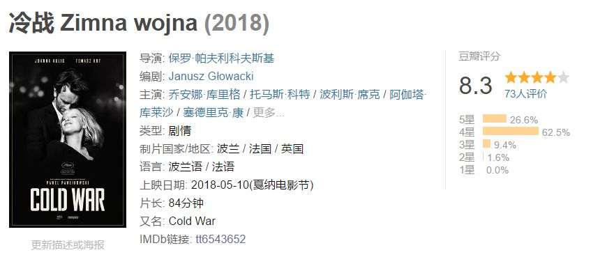 波兰电影其实一直都不缺少好作品,近年有《沃伦》、老片有《审问》,2018年最新的《冷战》则让保罗·帕夫利科夫斯基导演拿到了一个戛纳最佳导演。