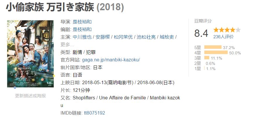这是第五部获得金棕榈奖的日本电影,顾名思义,这是一部温情家庭片。故事是关于一个处于社会底层的贫困家庭,靠着老母亲柴田初枝的养老金,以及男主柴田治的偷窃过日子。
