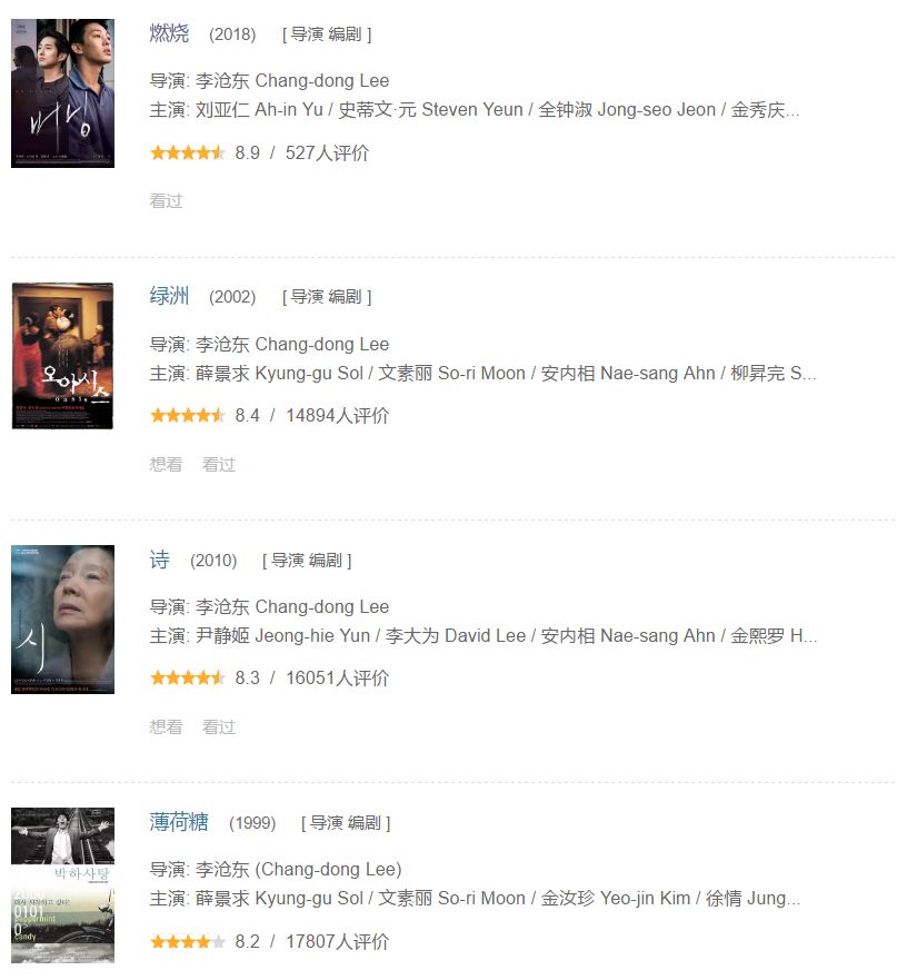 电影的导演是李沧东,他的作品并不多,但部部都是高质量,2010年的《诗》就获得戛纳最佳编剧奖,代表作《绿洲》提名过第59届威尼斯电影节的金狮奖。