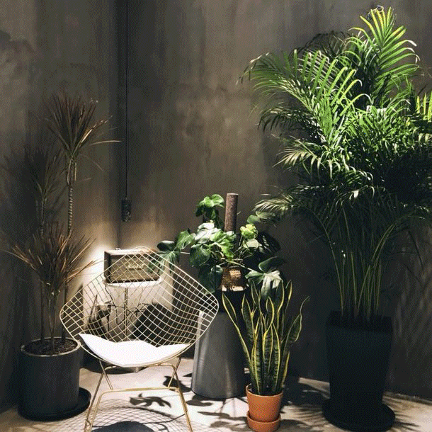 龟背竹搭配北欧铁艺椅子,灰色的墙上挂着蓝色的霓虹灯牌。未来感十足。