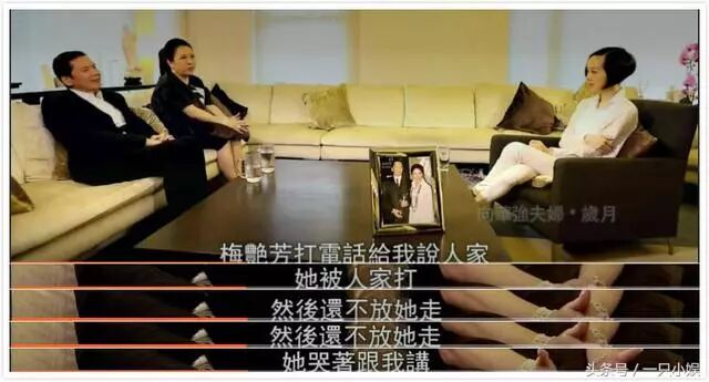 她说道:“梅艳芳打电话给我说她被人家(黑社会)打,还不放她走,她哭着和我讲,我半夜三更自己冲到现场去,梅艳芳当时喝醉了,就介绍这个所谓的电影公司老板,两个人都不认识,梅艳芳不肯握手,然后她就被人家打”,她继续说道:“幸好我老公之前无意间帮过那个幕后老板,打梅艳芳的就是那个幕后老板,所以她看到我也不会再凶下去了。”