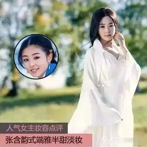 半永久淡妆要点:打造张含韵式端雅半甜淡妆,首先是白皙的底妆,底妆呈现牛奶般纯白则可。其次是自然的黑粗眉,轻描一层即可。