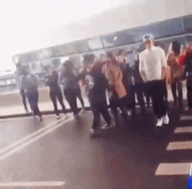 在机场,怕粉丝被行驶的车撞到,一并帮忙阻拦。