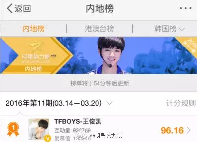 另外#明星势力榜#2016年第十一期冠军出炉!恭喜TFBOYS-王俊凯荣登内地榜榜首