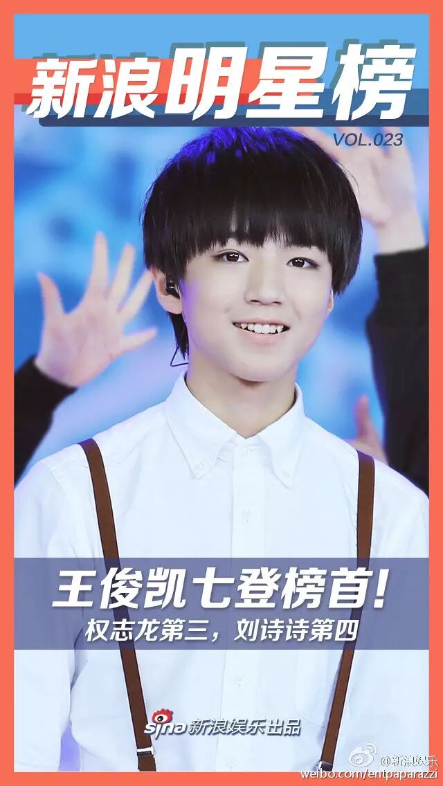 #新浪明星榜# 第23期成绩出炉!TFBOYS-王俊凯实力强劲,本期是TFBOYS王俊凯同学第七次拿下明星榜第一,同时也成为荣获冠军次数最多的明星,其中,他微博提及第一,粉丝爱慕第一,互动也排在第六,成绩单可谓相当亮眼。小凯不仅深受无数粉丝喜爱,也是大家的榜样,成为2016年绿植领养大使的他在微博上号召粉丝“让身边多一点绿色!”此举立即获得千万粉丝支持和点赞。人气王再接再厉!