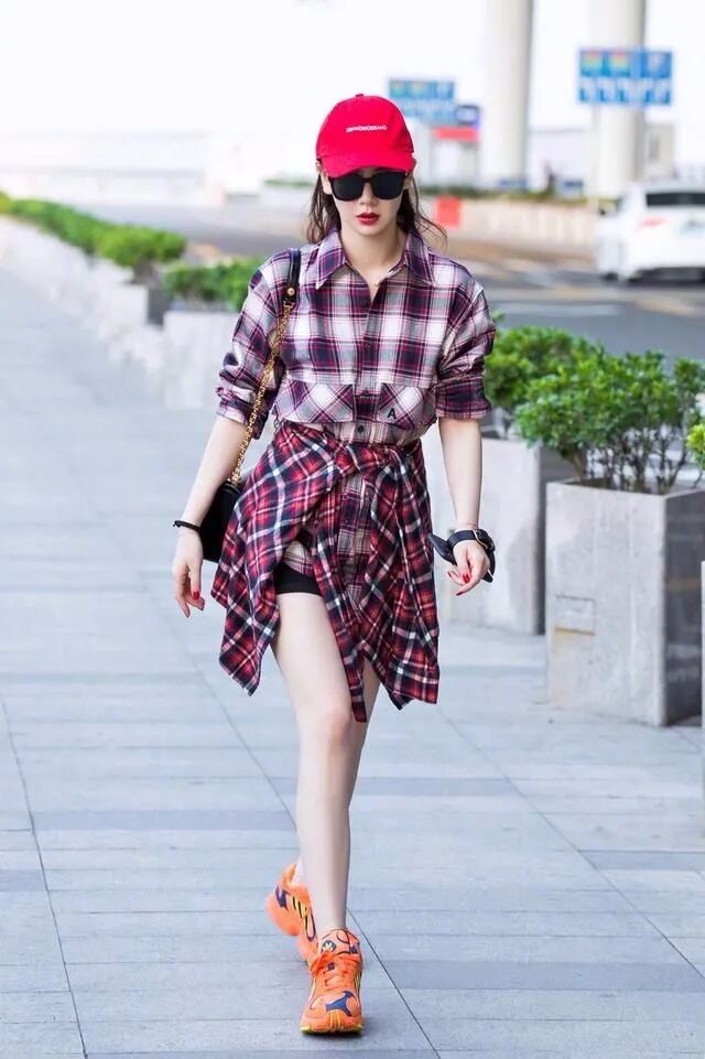 头上戴着一顶红色的帽子,而且口红的颜色也会让人觉得特别的有气场,上面穿的是一件格子的衬衫,下面本身搭配的是一条黑色的超短裤,只不过还把衣服扎在自己的腰间,所以显得还是特别的时髦。