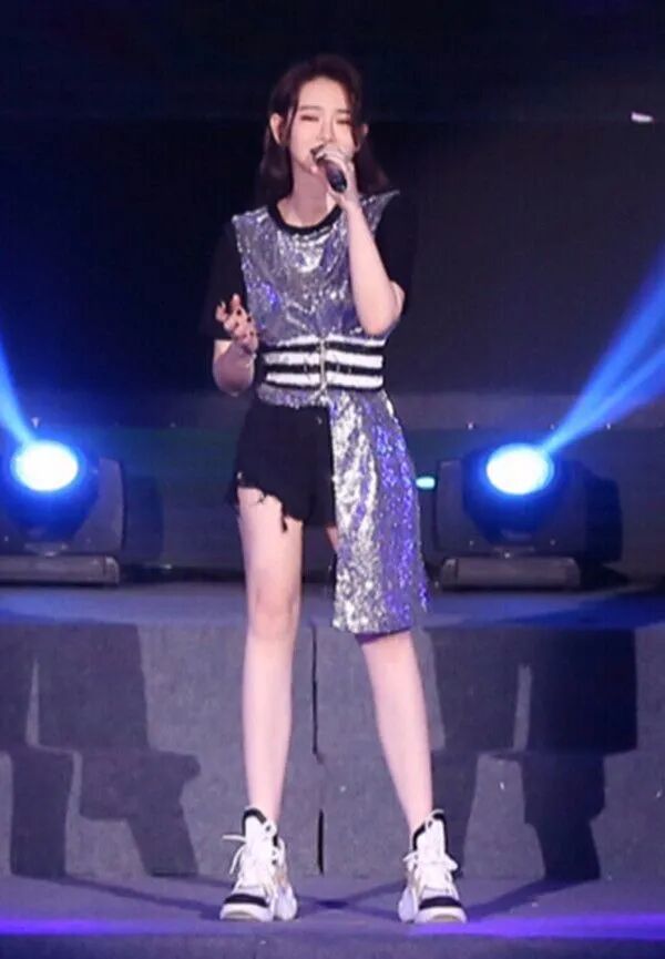 这次她站在舞台上面唱歌,身上穿的衣服也会显得比较有特色,而且她上面穿的衣服在灯光的照射下显得效果还是挺不错的,下面搭配的就是一条黑色的超短裤,所以下面的那一双腿只会觉得更加的纤细和修长。