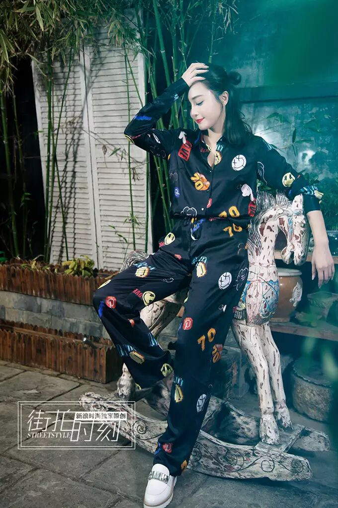 沉睡已久的睡衣风潮在2016来了一次大逆袭,如果你的衣柜里没有那么一两件睡衣风的服装,那么你就真的被时尚所抛弃了。秦岚这身黑色印花套装选择了缎面材质,拥有睡衣的舒适感,俏皮的emoji印花又给人活力十足的感觉,穿出街正合适。