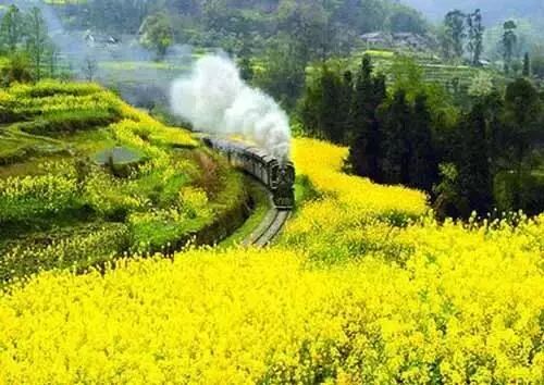 三月 嘉阳小火车 罗城古镇蒸汽式小火车行驶在群山幽壑、层层梯田之中